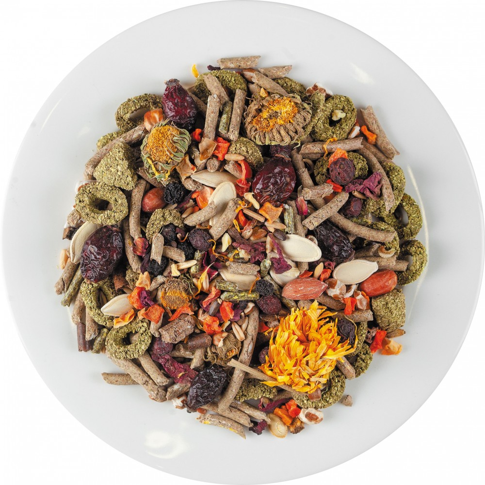 Склад: комбікорм, трав’яний гранулят в асортименті, овес голозерний, маїс, протеїново-мінеральний гранулят, насіння розторопші, повітряна пшениця, сушений гарбуз, яблука сушені гранульовані, сочевиця червона, гібіск, сушений буряк, морква сушена, насіння гарбуза, шипшина, кероб подрібнений, глід, квіти календули, аронія, арахіс, пастернак сушений, насіння льону.