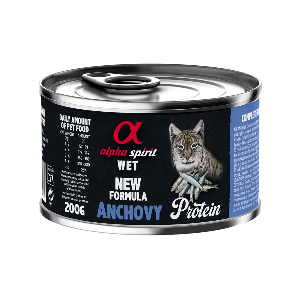 Ніжна та смачна рецептура вологого корму Альфа Спірітз анчоусами (94%) у формі паштету – це вишуканий витвір кулінарного мистецтва, створений для задоволення потреб дорослих котів всіх порід.