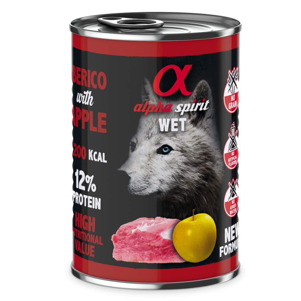 Ніжна та смачна рецептура вологого корму Альфа Спіріт з іберійською свининою (93%) та яблуками у формі паштету створена для дорослих собак всіх порід.