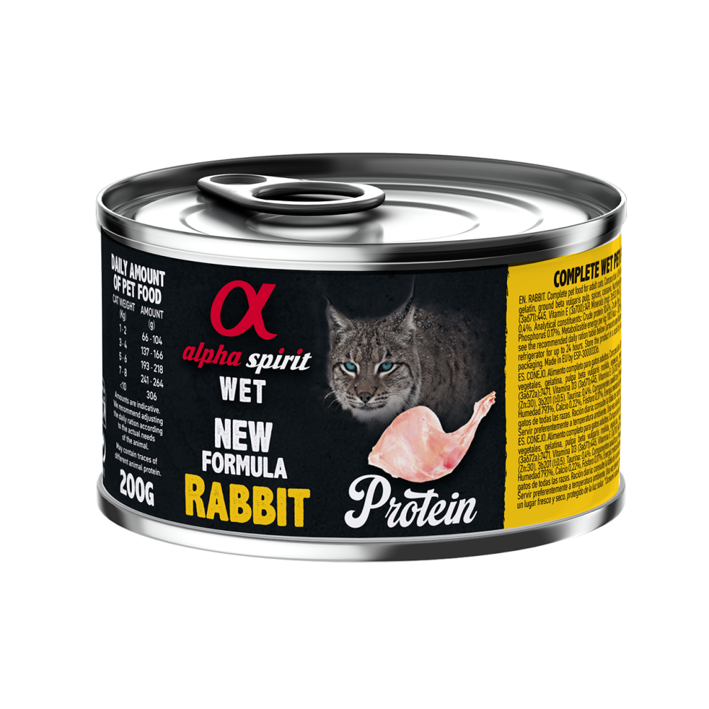 Вологий корм Alpha Spirit Rabbit Adult Cat для дорослих котів виготовляється з інгредієнтів преміальної якості з добавкою таурину для здоров’я зору та серця.