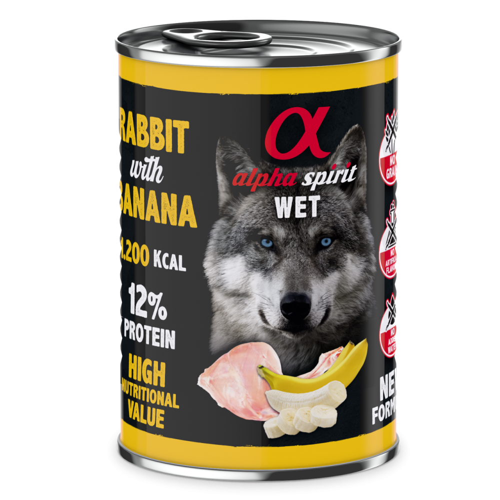 Ніжна та смачна рецептура вологого корму Альфа Спіріт з кроликом та бананами у формі паштету створена для дорослих собак всіх порід.