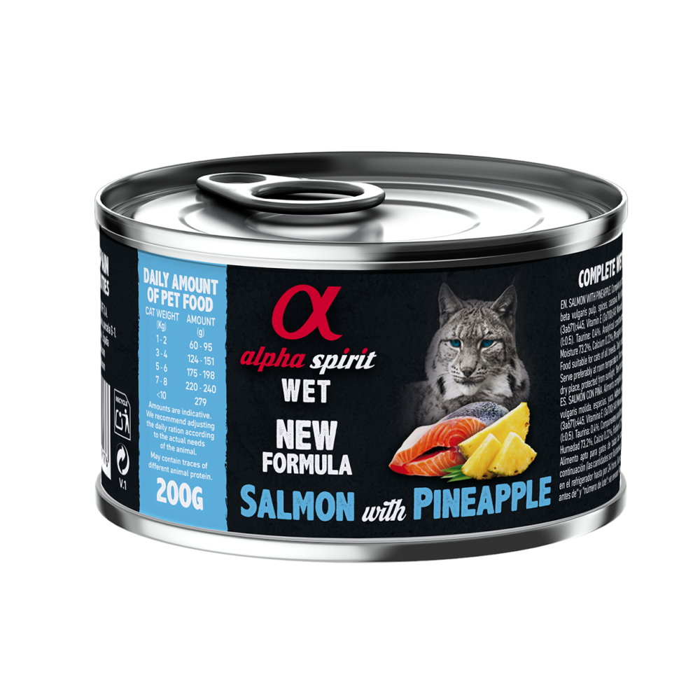 Вологий корм Alpha Spirit Salmon with Pineapple для дорослих котів готується з інгредієнтів преміальної якості та добавкою таурину, де єдинимджерелом протеїну – є лосось (93%).