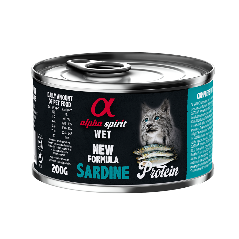 Вологий корм Alpha Spirit Sardine for Adult Cats для котів створюється з інгредієнтів преміальної якості з добавкою таурину, де єдиним джерелом протеїнує сардина.
