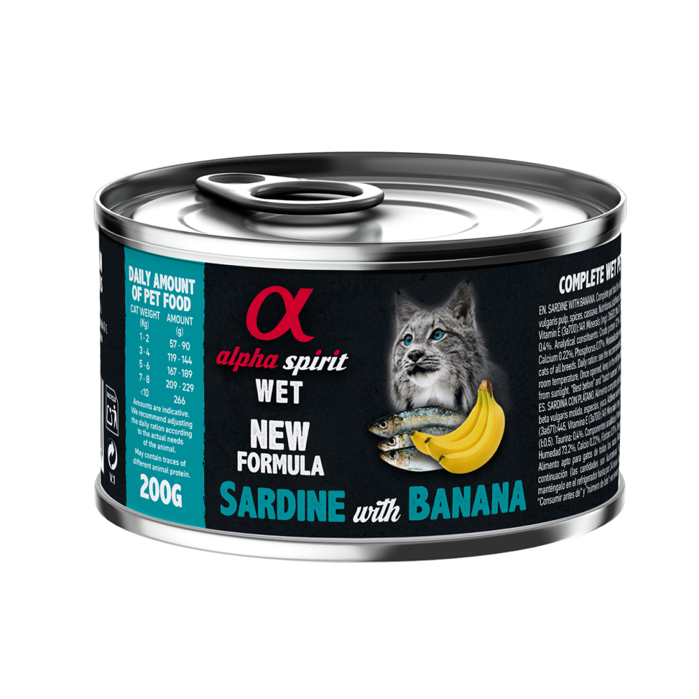 Вологий корм Alpha Spirit Alpha Spirit Sardine with Bananaдля дорослих котів готується з добавкою таурину, де єдинимджерелом протеїну – є сардина (93%).