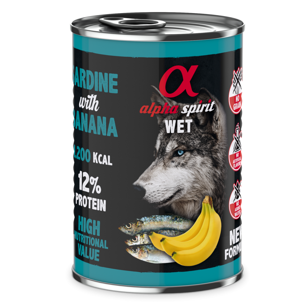 Вологий корм Alpha Spirit Alpha Spirit Sardine with Banana готується з використанням єдиного джерела протеїну – сардини, з додаванням шматочків свіжого банану .