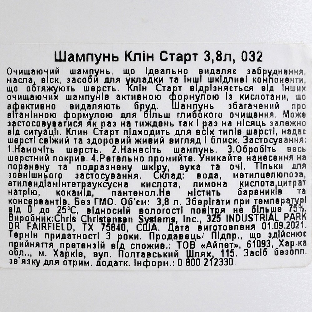 Шампунь, що очищує та ідеально видаляє забруднення, масла, віск, засоби для укладки та інші шкідливі компоненти, що обтяжують шерсть. Clean Start відрізняється від інших очищаючих шампунів активною формулою з кислотами, що ефективно видаляють бруд. Шампунь збагачений провітамінною формулою для глибшого очищення. Може застосовуватися як раз на тиждень, так і раз на місяць, залежно від ситуації. Clean Start підходить для всіх типів шерсті, надає шерсті свіжого та здорового вигляду і блиску.