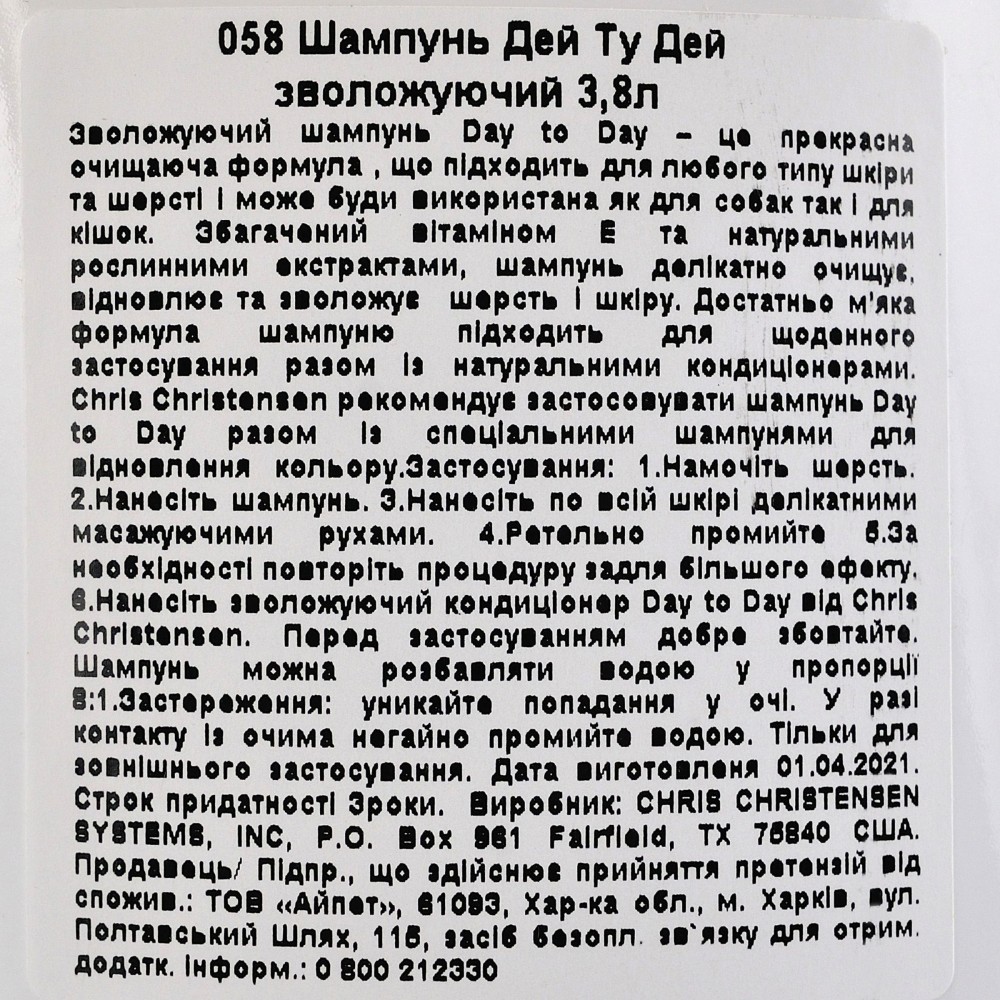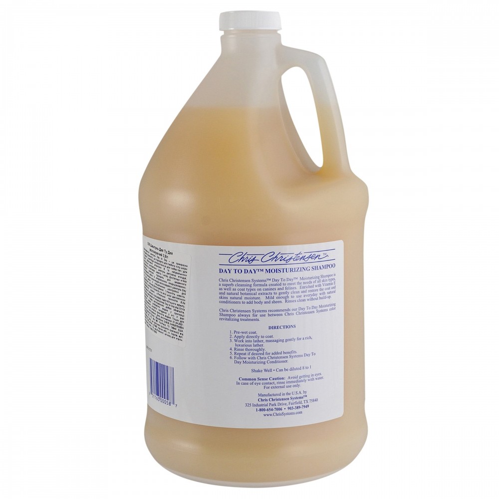 Зволожуючий шампунь Day to Day – це чудова очищаюча формула, що підходить для будь-якого типу шкіри та шерсті й може буди використана як для собак, так і для котів. Збагачений вітаміном Е та натуральними рослинними екстрактами, шампунь делікатно очищує, відновлює та зволожує шерсть і шкіру. Достатньо м’яка формула шампуню підходить для щоденного застосування разом із натуральними кондиціонерами. Chris Christensen рекомендує застосовувати шампунь Day to Day разом із спеціальними шампунями для відновлення кольору.