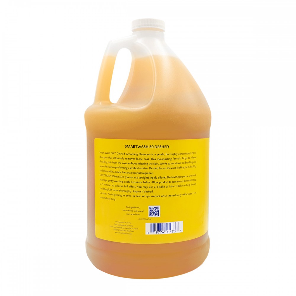 Шампунь SmartWash50 De-Shed від Chris Christensen – це м'який, висококонцентрований засіб, що ефективно видаляє шерсть, яка линяє. Продукт розбавляється у співвідношенні 50:1, збагачений зволожуючими компонентами, допомагає видалити волосинки, що випали із шерсті, не подразнюючи шкіру. Надає шерсті свіжого, здорового і блискучого вигляду, наповнюючи тонким бананово-кокосовим ароматом.