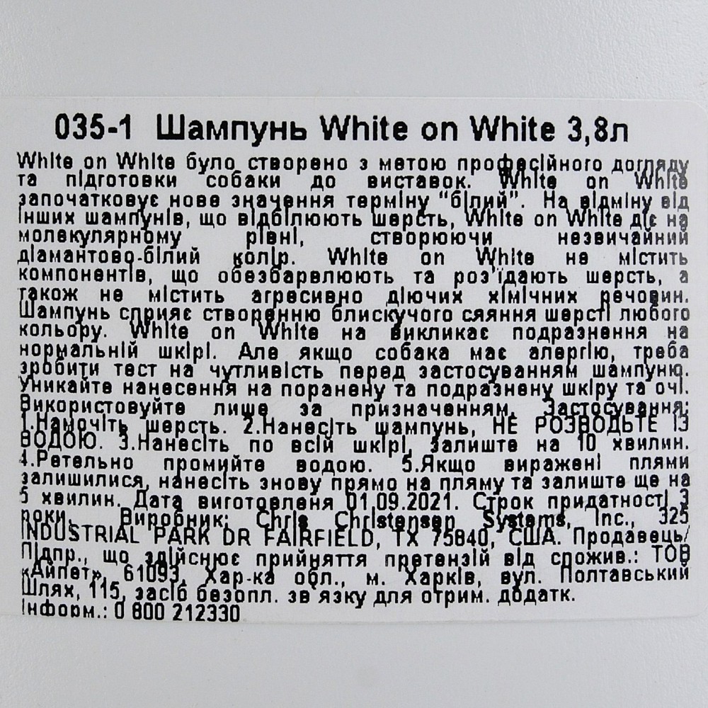 Шампунь було створено для професійного догляду та підготовки собаки до виставок. White on White започатковує нове значення терміну “білий”. На відміну від інших шампунів, що відбілюють шерсть, White on White діє на молекулярному рівні, створюючи незвичайний діамантово-білий колір. White on White не містить компонентів, що знебарвлюють і роз’їдають шерсть, а також агресивно діючих хімічних речовин. Шампунь допомагає створити блискуче сяяння шерсті будь-якого кольору.