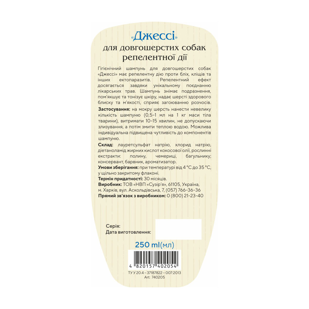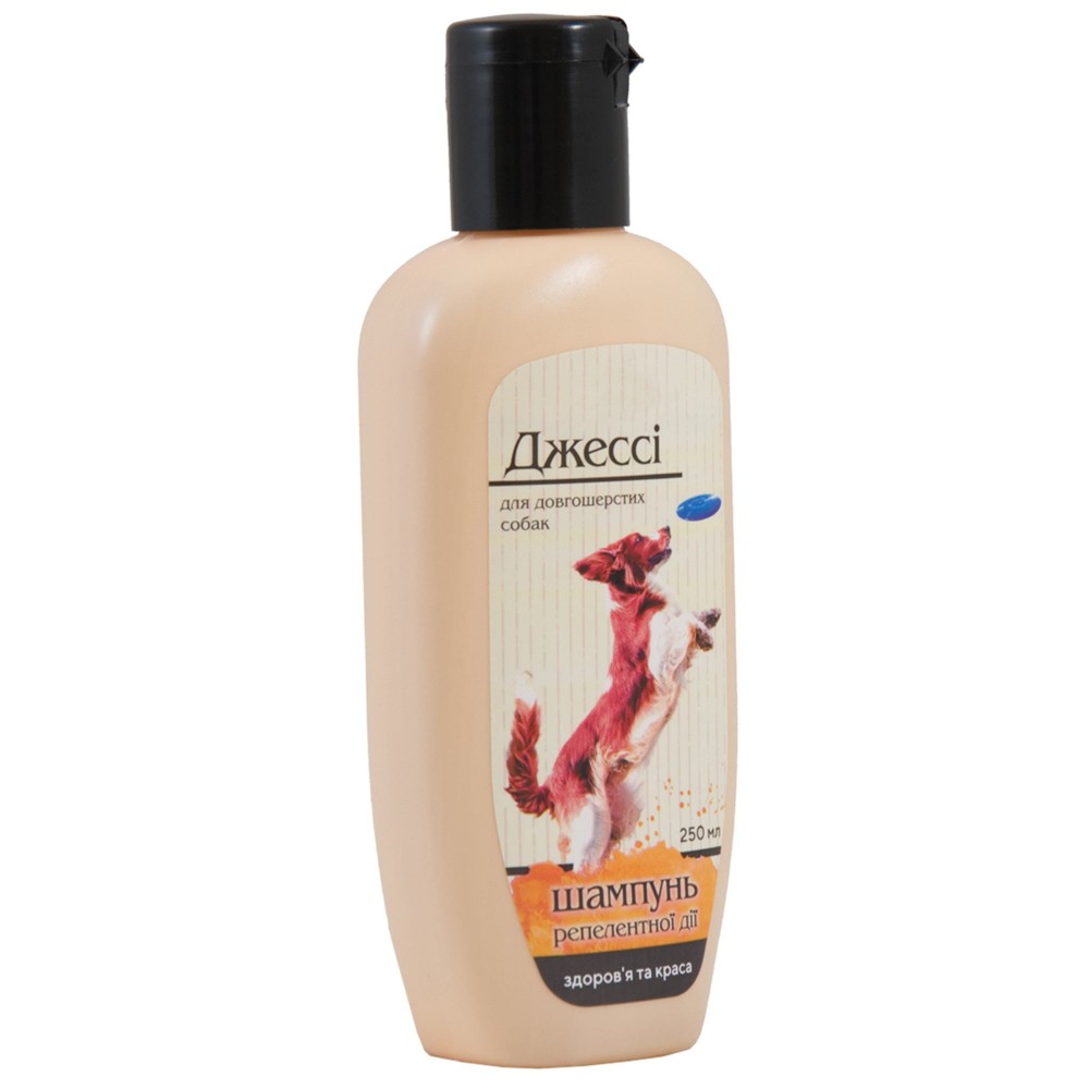 Гігієнічний шампунь для довгошерстих собак «Джессі» має репелентну дію проти бліх, кліщів та інших ектопаразитів. Репелентний ефект досягається завдяки унікальному поєднанню лікарських трав. Шампунь знімає подразнення, пом’якшує та тонізує шкіру, надає шерсті здорового блиску та м’якості, сприяє загоюванню розчосів.