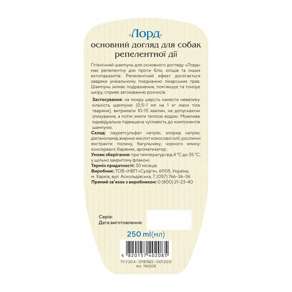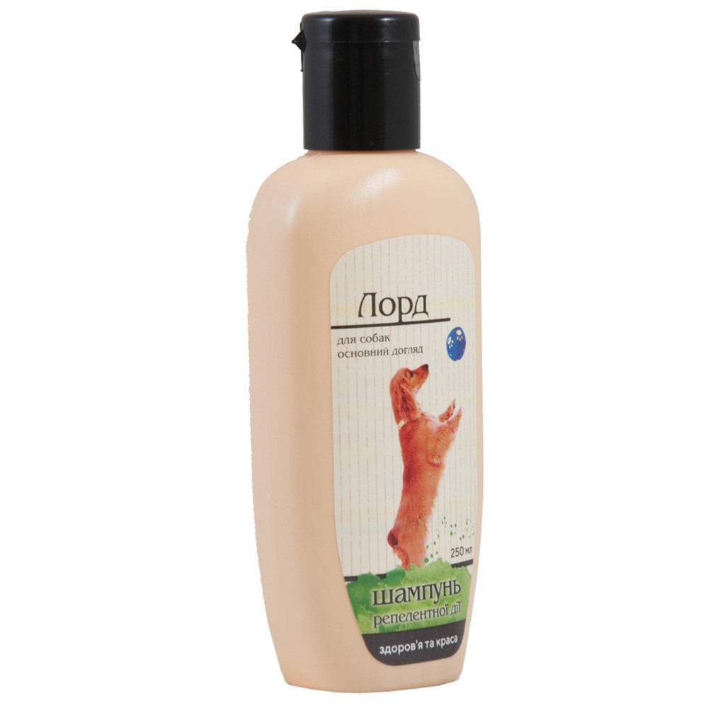 Гігієнічний шампунь для основного догляду собак «Лорд» має репелентну дію проти бліх, кліщів та інших ектопаразитів. Репелентний ефект досягається завдяки унікальному поєднанню лікарських трав. Шампунь знімає подразнення, пом’якшує та тонізує шкіру, сприяє загоюванню розчосів.