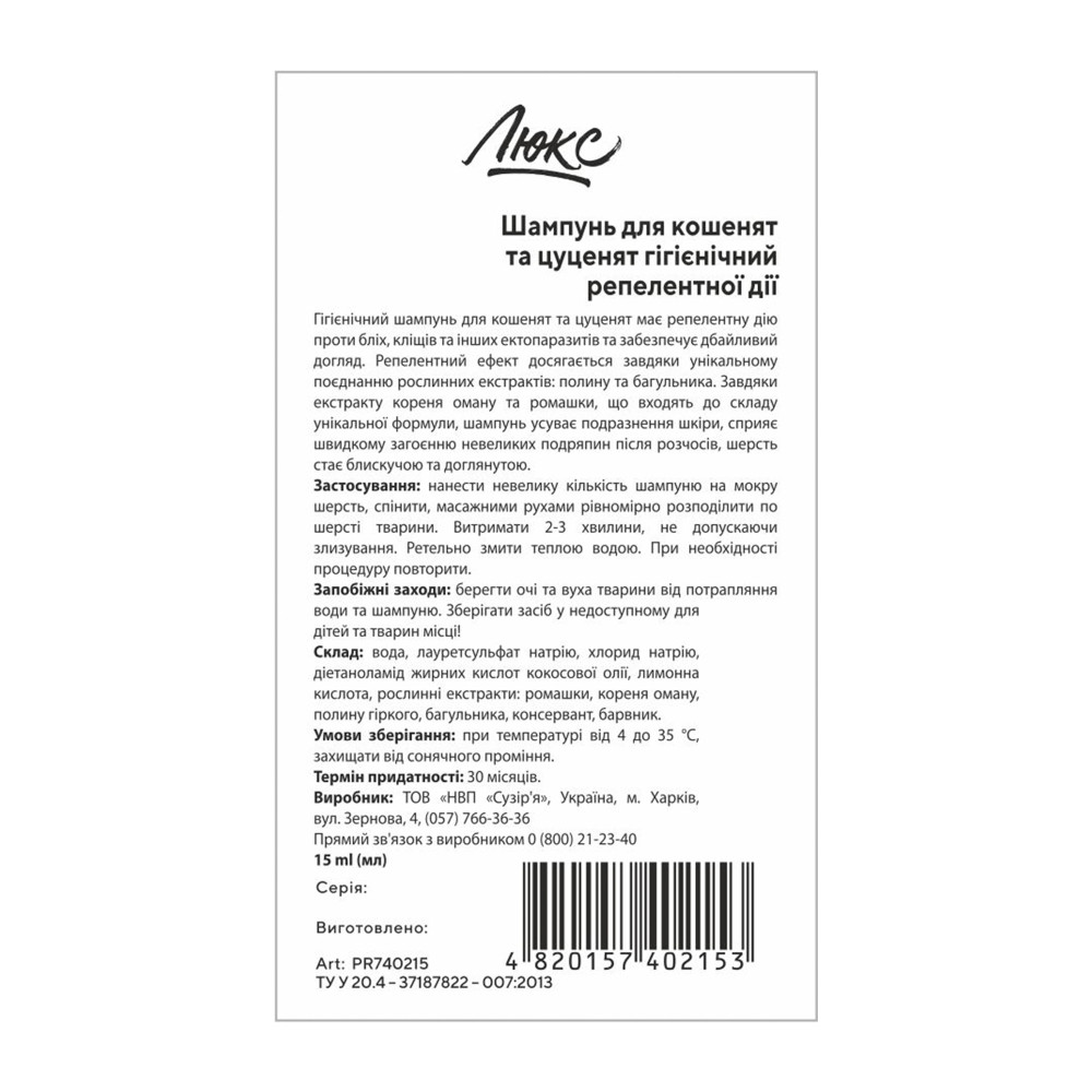 Гігієнічний шампунь для кошенят та цуценят має репелентну дію проти бліх, кліщів та інших ектопаразитів. Репелентний ефект досягається завдяки вмісту рослинних екстрактів: полину та багульника. Завдяки екстракту кореня оману та ромашки, що входять до складу унікальної формули, шампунь усуває подразнення шкіри, сприяє швидкому загоєнню невеликих подряпин після розчосів, шерсть стає блискучою та доглянутою.