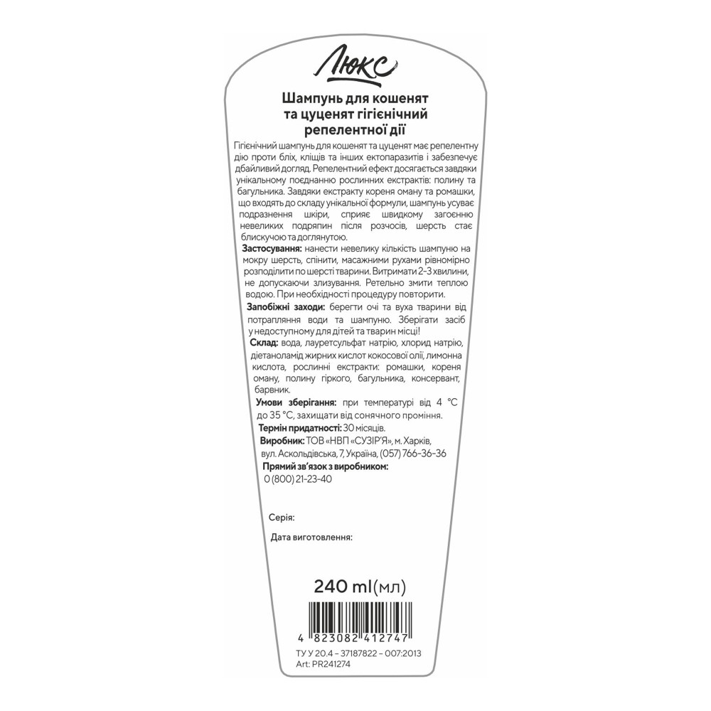 Гігієнічний шампунь для кошенят та цуценят має репелентну дію проти бліх, кліщів та інших ектопаразитів. Репелентний ефект досягається завдяки вмісту рослинних екстрактів: полину та багульника. Завдяки екстракту кореня оману та ромашки, що входять до складу унікальної формули, шампунь усуває подразнення шкіри, сприяє швидкому загоєнню невеликих подряпин після розчосів, шерсть стає блискучою та доглянутою.