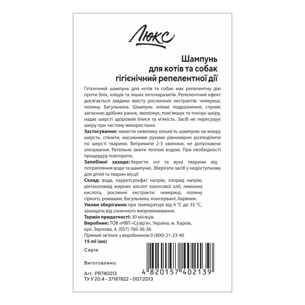 Склад: Вода, лауретсульфат натрію, хлорид натрію, діетаноламід жирних кислот кокосової олії, лимонна кислота, рослинні екстракти: чемериці, полину гіркого, ромашки, багульника, консервант, барвник.