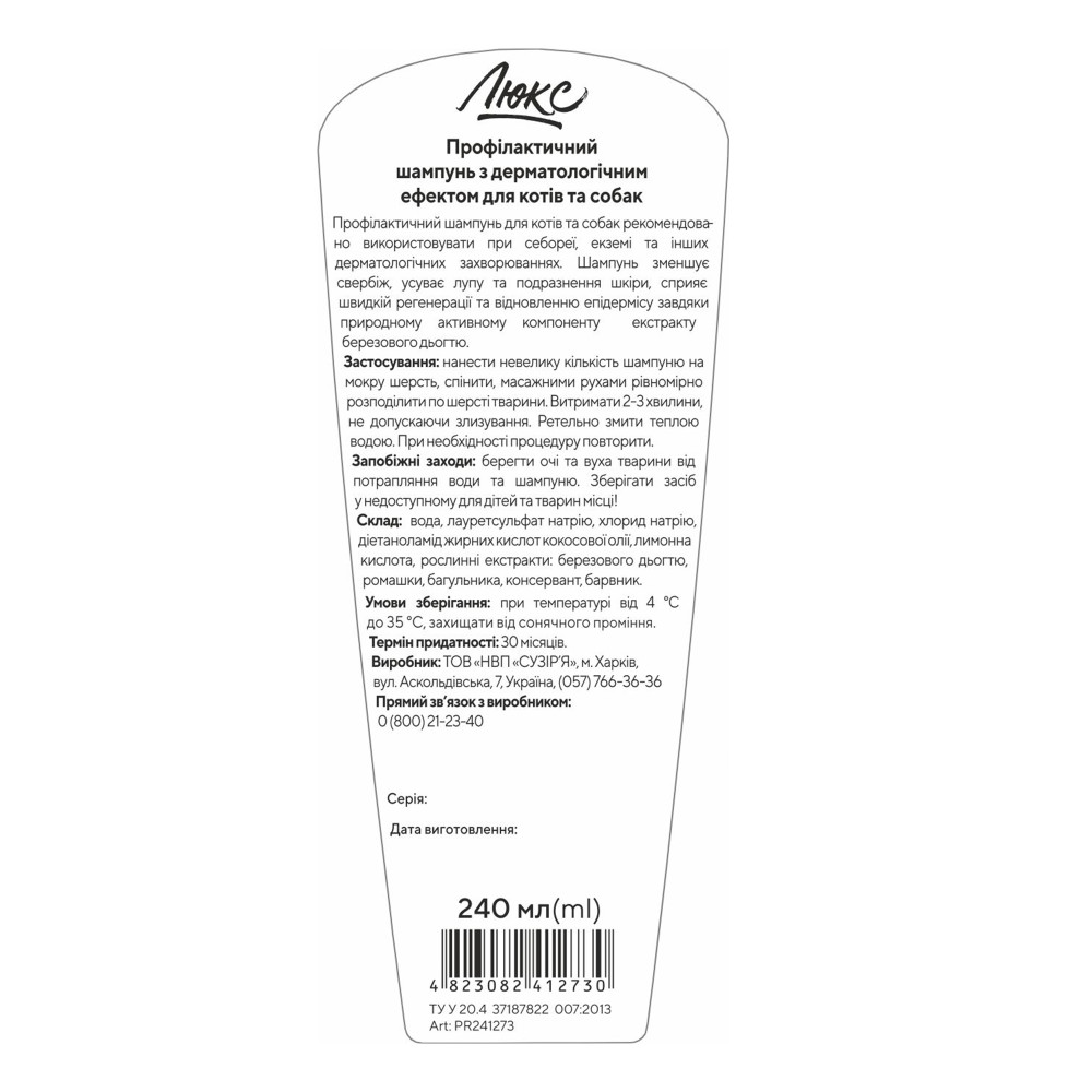 Профілактичний шампунь для котів та собак рекомендовано використовувати при себореї, екземі та інших дерматологічних захворюваннях. Шампунь зменшує свербіж, усуває лупу та подразнення шкіри, сприяє швидкій регенерації та відновленню епідермісу завдяки природному активному компоненту – екстракту березового дьогтю.