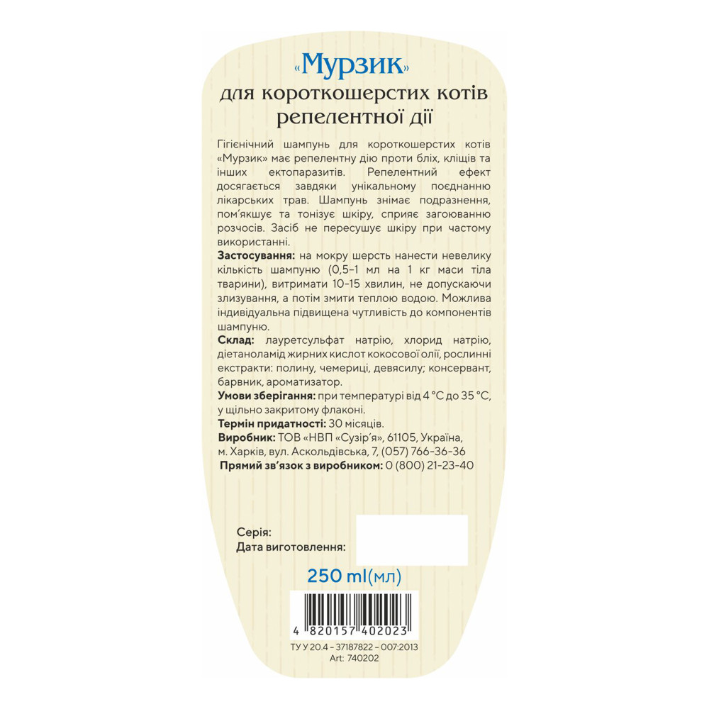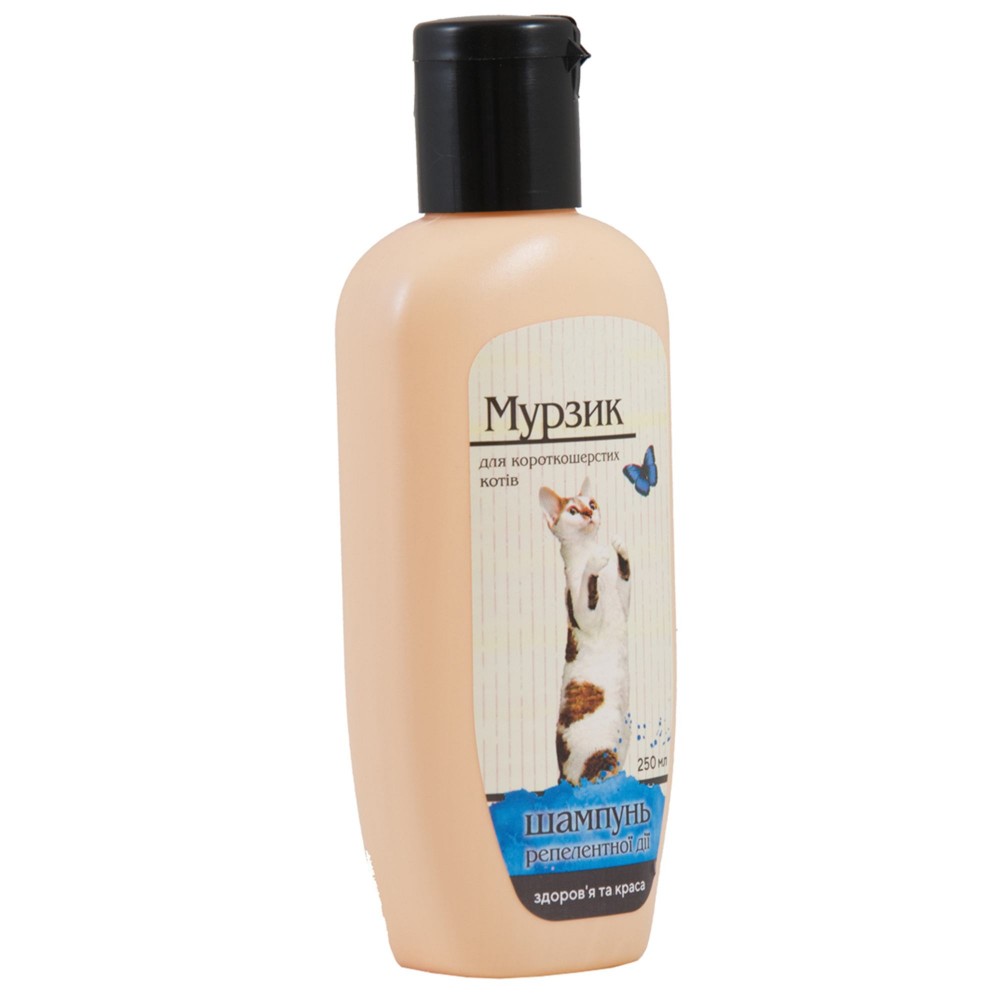 Гігієнічний шампунь для короткошерстих котів «Мурзик» має репелентну дію проти бліх, кліщів та інших ектопаразитів. Репелентний ефект досягається завдяки унікальному поєднанню лікарських трав. Шампунь знімає подразнення, пом’якшує та тонізує шкіру, сприяє загоюванню розчосів. Засіб не пересушує шкіру при частому використанні.