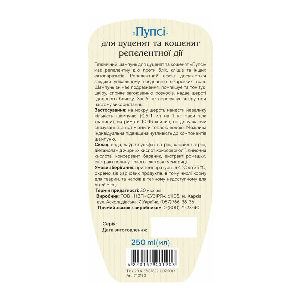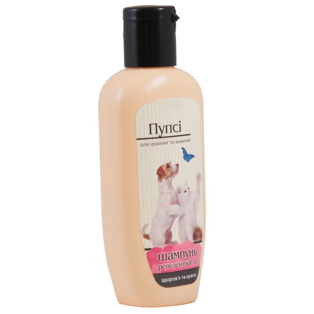 Гігієнічний шампунь для цуценят та кошенят «Пупсі» має репелентну дію проти бліх, кліщів та інших ектопаразитів. Репелентний ефект досягається завдяки унікальному поєднанню лікарських трав. Шампунь знімає подразнення, пом’якшує та тонізує шкіру, сприяє загоюванню розчосів, надає шерсті здорового блиску. Засіб не пересушує шкіру при частому використанні.