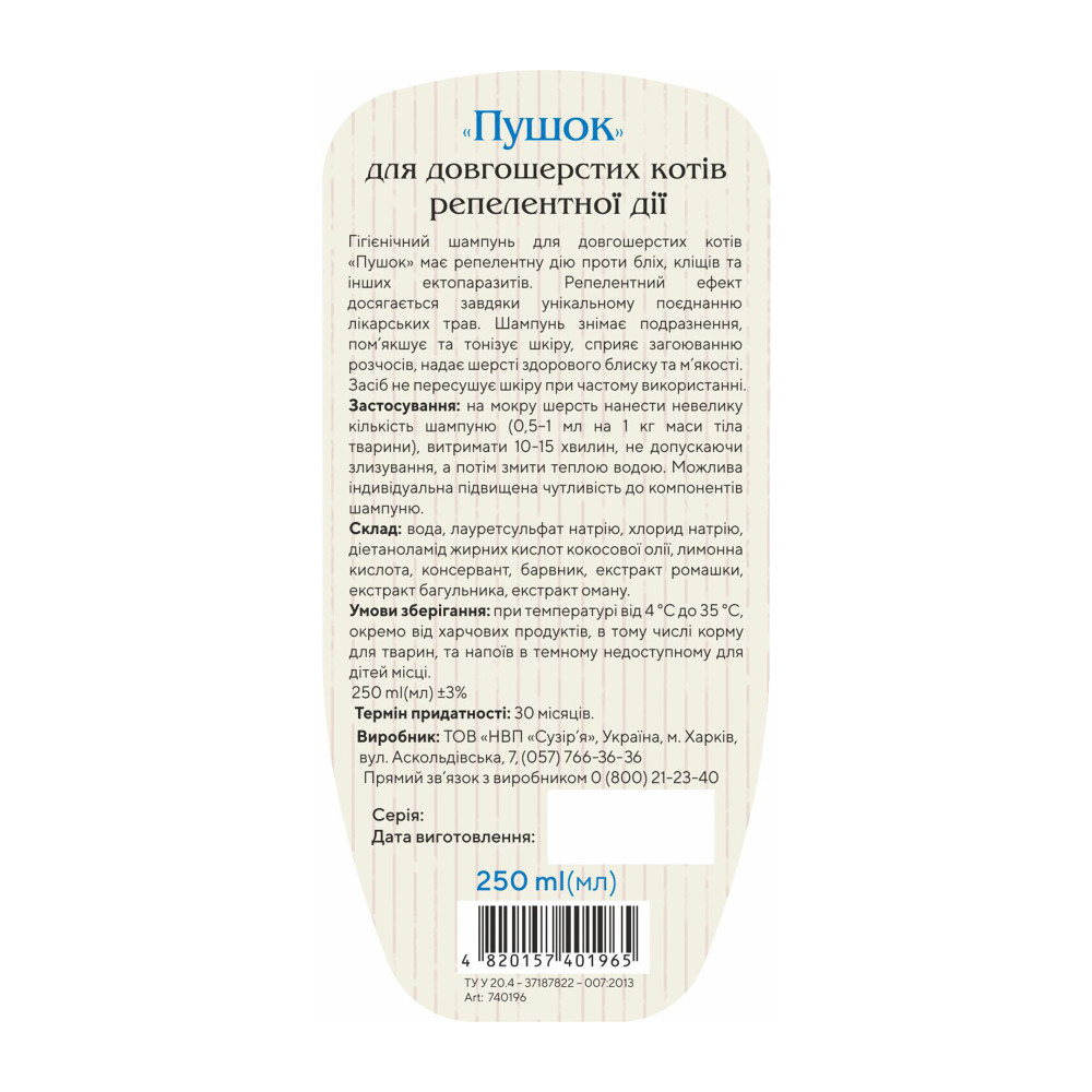 Гігієнічний шампунь для довгошерстих котів «Пушок» має репелентну дію проти бліх, кліщів та інших ектопаразитів. Репелентний ефект досягається завдяки унікальному поєднанню лікарських трав. Шампунь знімає подразнення, пом’якшує та тонізує шкіру, сприяє загоюванню розчосів, надає шерсті здорового блиску та м’якості. Засіб не пересушує шкіру при частому використанні.