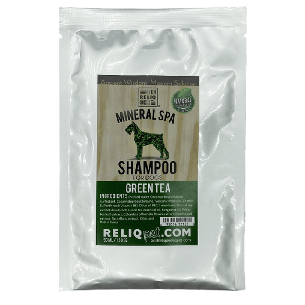 Reliq Mineral Spa Green Tea Shampoo - шампунь з екстрактом листя зеленого чаю та натуральними мінералами, який очищає, зволожує, заспокоює й додає красу та сяйво шерсті собак. Завдяки тому, що до складу входять мийні компоненти Nanotech, отримані з обробленого вулканічного попелу, шампунь має унікальні очищувальні та цілющі властивості. Наночастинки розчиняють елементи, що викликають неприємний запах, одночасно відновлюючи шкіру та звужуючи пори.