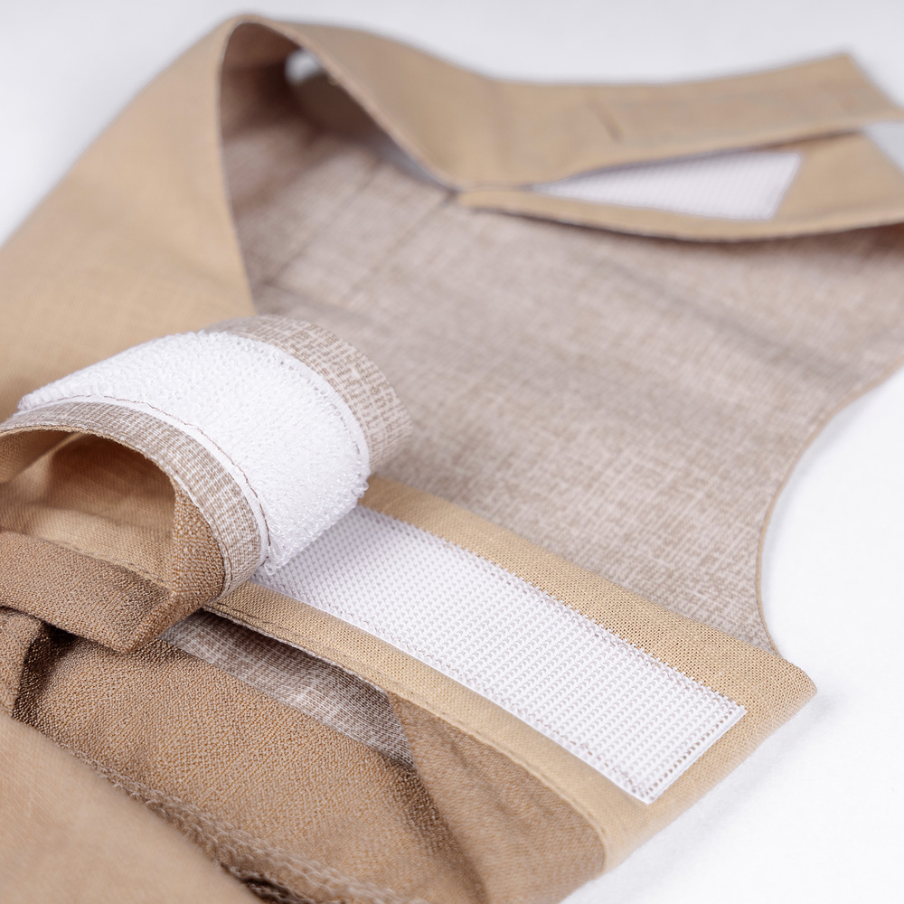 Костюм з льону та бавовни дуже комфортний у спекотну погоду. За потреби штанці можна зняти (вони приєднуються до верхньої частини вбрання за допомогою застібки-блискавки), і костюм перетвориться на зручну шлею-жилет із надійними застібками-липучками на горловині й талії.