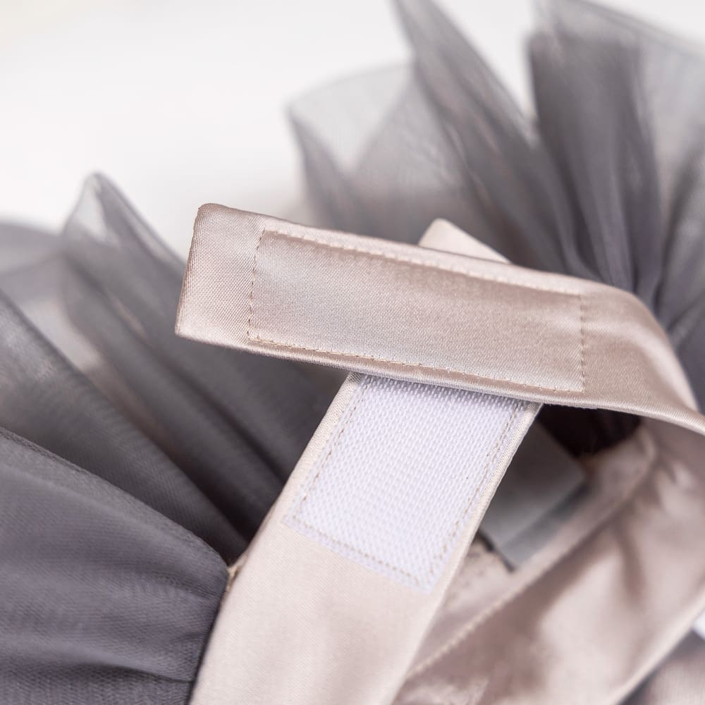 Пишна спідниця виготовлена з легкого фатину, пояс та бант – з атласної тканини. М’яка шлейка надійно фіксує вбрання, а пояс з липучкою дозволяє підігнати спідничку по фігурі.