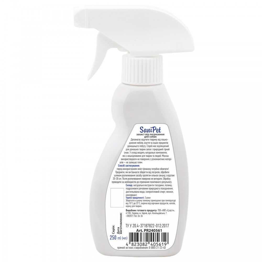 Спрей допомагає відучити собак та цуценят від пошкодження меблів, взуття й інших предметів. Засіб має відлякуючий для собак запах і гіркий смак. До складу входять натуральні компоненти, нешкідливі для тварин і людей. Можна використовувати на поверхні будь-яких матеріалів. Деяким собакам властиво через кілька тижнів пробувати гризти речі знову. В такому випадку процедура захисту повторюється.