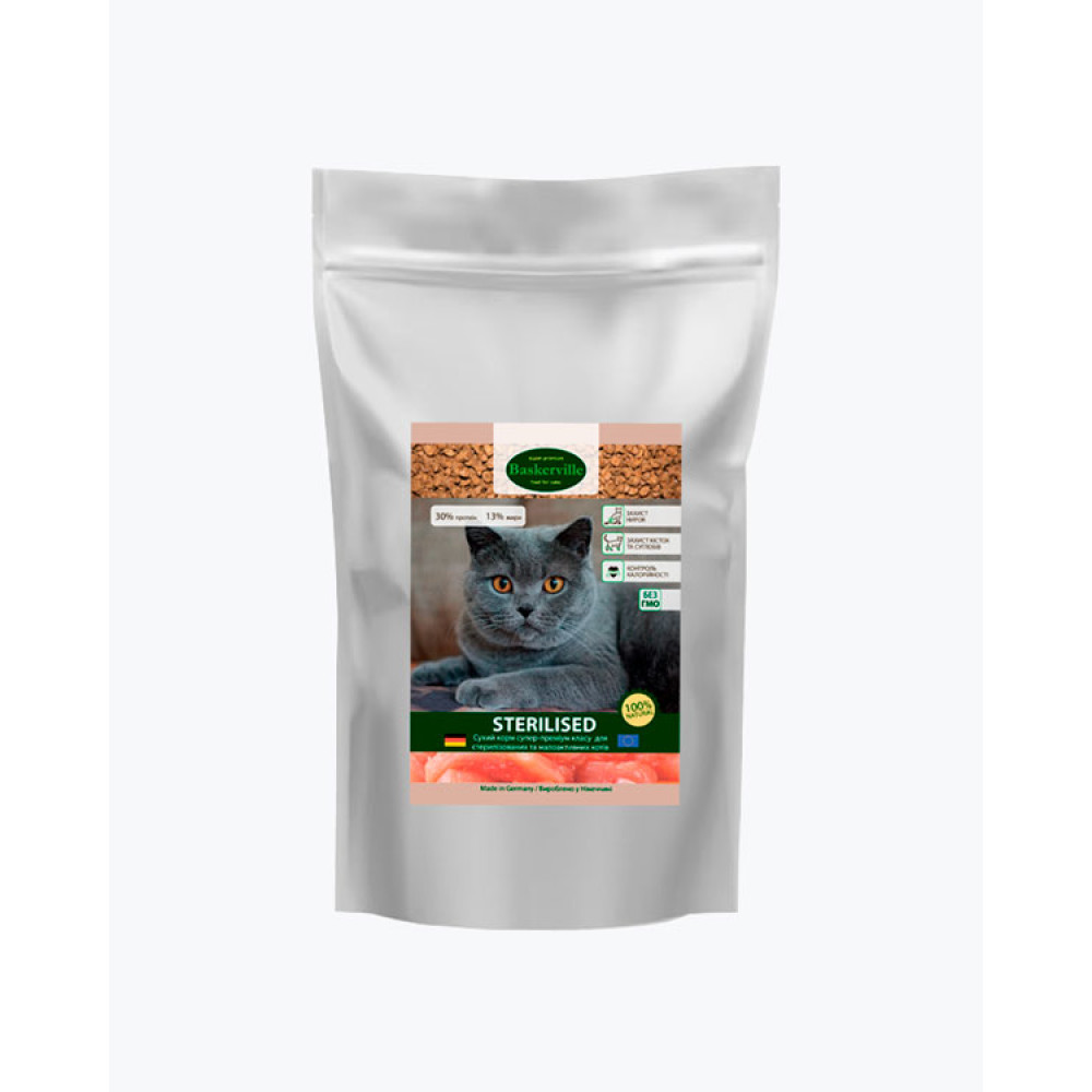 Опис: Сухий корм BASKERVILLE розроблений враховуючи всі особливості стерилізованих та малоактивних котів. Має низку важливих переваг, які сприяють здоров'ю та довголіттю ваших домашніх улюбленців: тваринний білок високої біологічної цінності, що сприяє підтримці м’язової маси навіть за низького рівня фізичної активності; містить знижений вміст калорій, що допомагає запобігти ожирінню, при цьому зберігаючи ситість; збалансований за рівнем мінералів. Не містить консервантів, барвників та синтетичних добавок. Без ГМО.