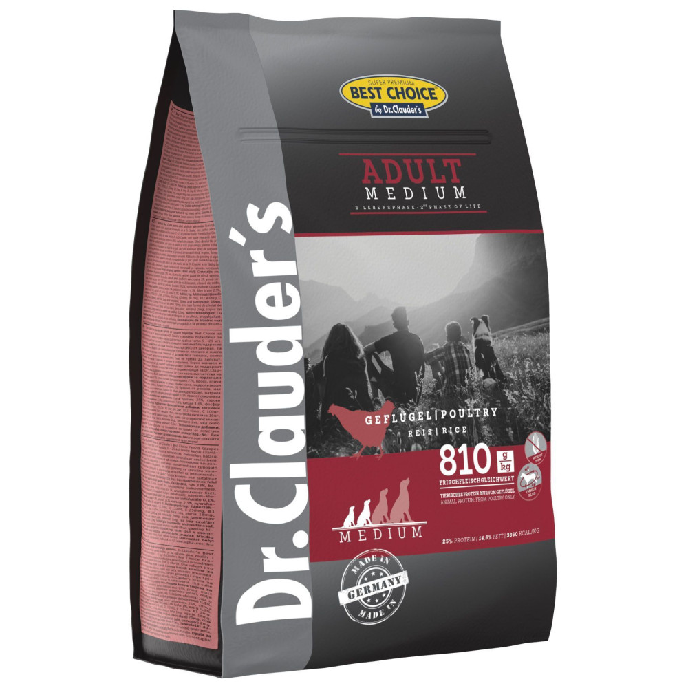 Др.Клаудерс Бест Чойс Едалт Медіум  - повнораціонний сухий корм для дорослих собак малих та середніх порід (вагою від 5 до 25кг). Корм дуже легко засвоюється завдяки натуральному пребіотичному волокну (FOS) з цикорію. Ідеальне харчування для вашої собаки з високоякісним білком птиці та омега-3, омега-6 жирними кислотами для блискучої шерсті. Додаються також бета-глюкани з дріжджів, які підтримують імунну систему собаки. Формула додатково збагачена комплексом женьшеню та спіруліни, для зміцнення імунної системи та покращення самопочуття. Не містить пшениці, не містить кукурудзи. Без додавання консервантів.