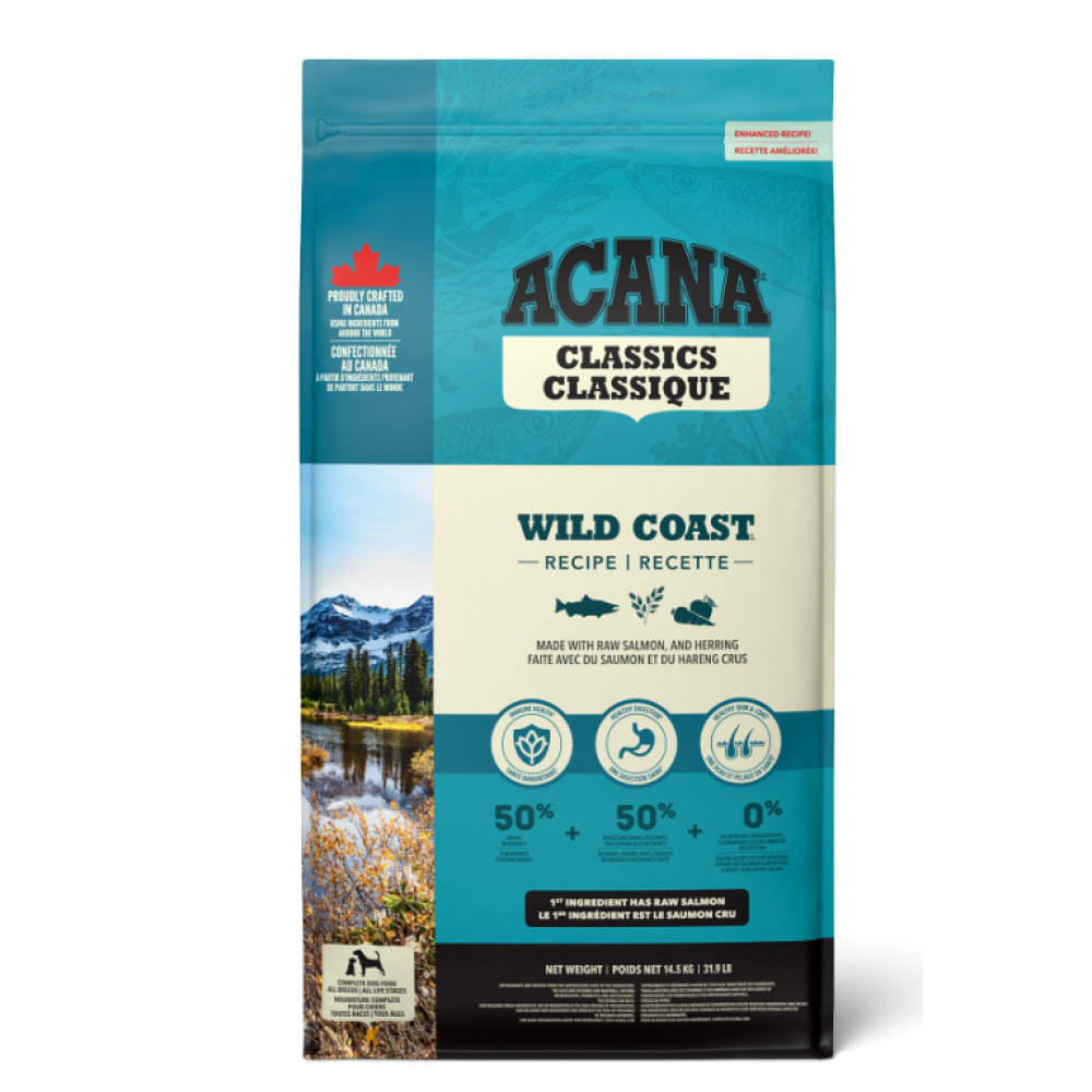 Рецептури ACANA ретельно створюються зі смачних та якісних інгредієнтів. Раціон, де баланс розподілений у співвідношенні 50/50 між багатим вмістом рибних інгредієнтів та поживними фруктами, зерновими та овочами. Рецептура АКАНА Класікс Вайлд Коуст Ресіпе забезпечує вашого собаку ситною та поживною їжею, створеною з простих та корисних інгредієнтів.