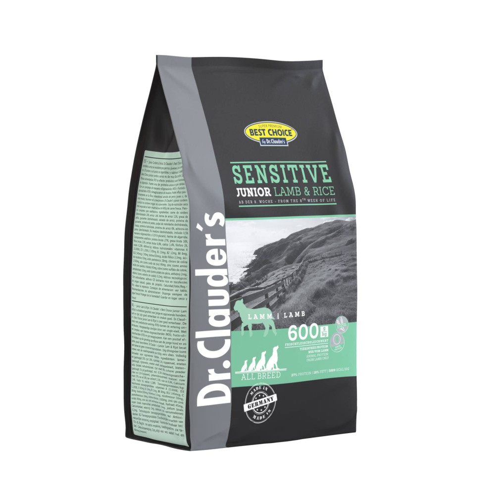 Др.Клаудерс Сенсетів Юніор Ягня та Рис  - повнораціонний сухий корм для цуценят усіх порід з чутливим травленням та втратою апетиту. Відмінно засвоюється завдяки пребіотичним волокнам, гіпоалергенним, високоякісному тваринному та рослинному білку Комплекс маннан-олігосахаридів (MOS), фрукто-олігосахаридів (FOS) та бета-глюкану з дріжджів, позитивно впливають на чутливу кишкову флору молодих собак, сприяє зміцненню імунної системи та здоровому росту. Не містить пшениці, не містить кукурудзи. Без додавання консервантів.