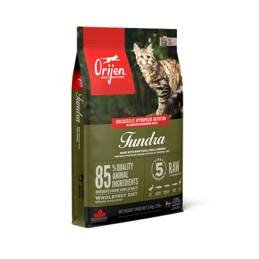 Як обов’язкові м’ясоїдні, сучасні коти влаштовані так само як і їх предки, тому для того, щоб бути здоровими та перебувати у найкращій кондиції їм необхідні Біологічно Відповідні раціони з багатим вмістом протеїнів та жирів з різноманітних видів м’яса. ORIJEN Tundra Cat виготовлений зі свіжих або сирих м’ясних інгредієнтів, таких як качка, риба та оленина.