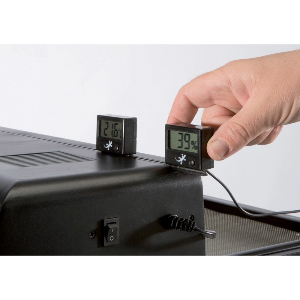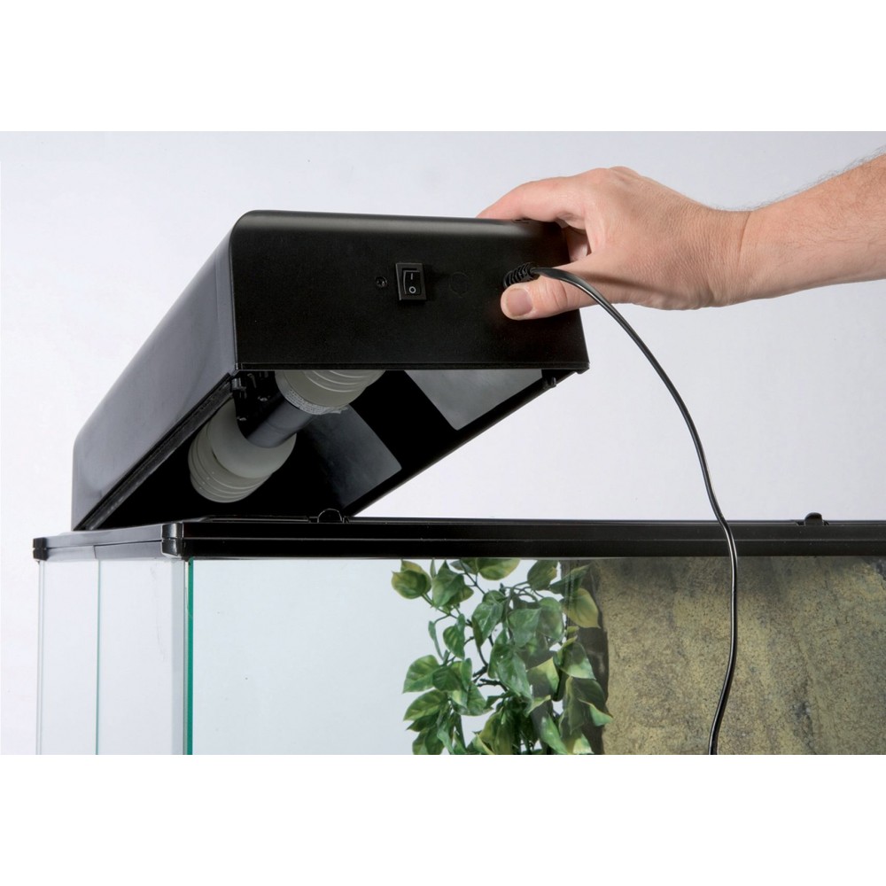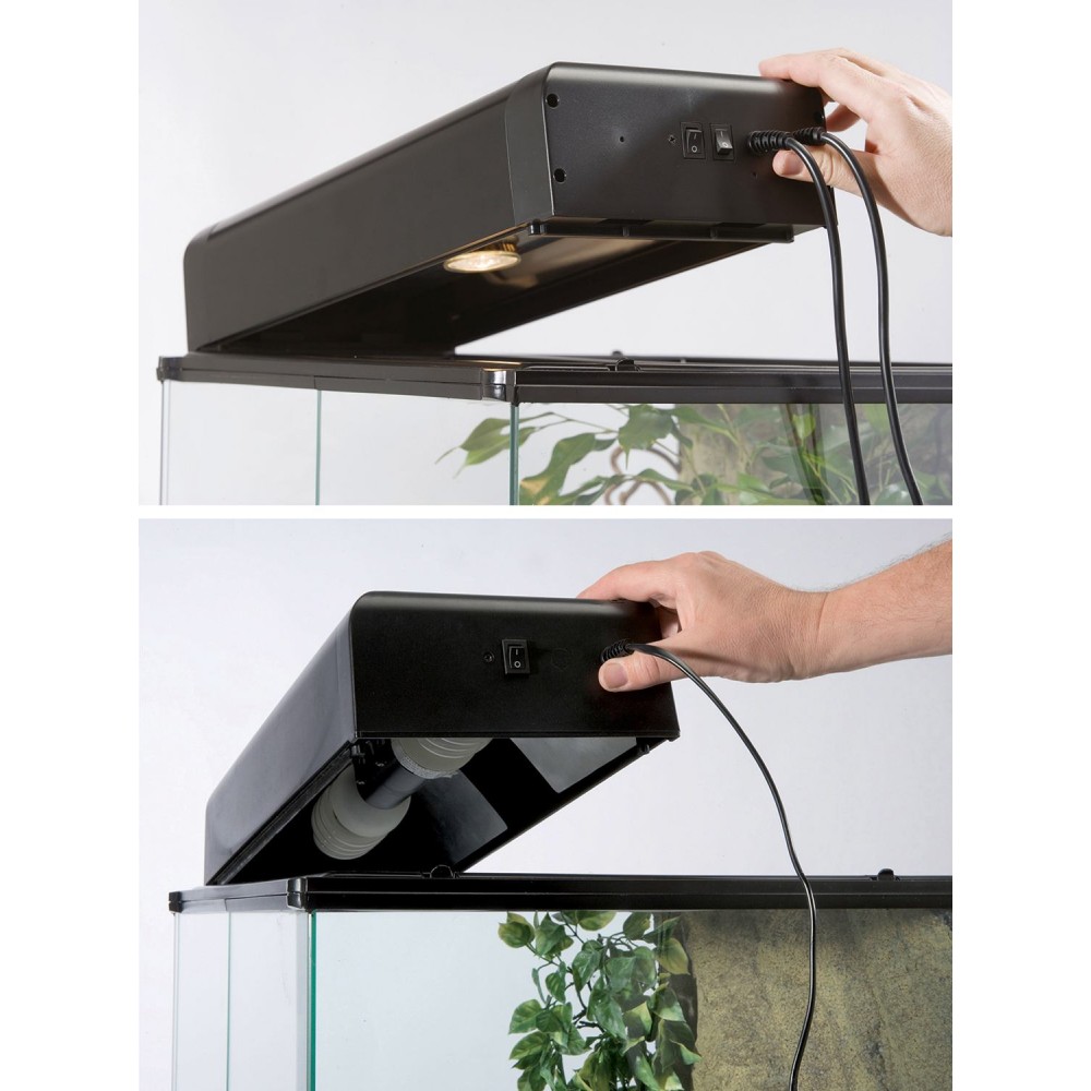 Можна створити комбінацію різних компактних люмінесцентних ламп Exo Terra Repti Glo (# PT2226, PT2227, PT2228) для створення ідеального співвідношення ультрафіолетового/візуального світла або поєднання з джерелом розжарювання, таким як денна теплова лампа (# PT2100-PT2114 ) для підвищення температури навколишнього повітря. Додаткові аксесуари, такі як цифровий термометр Exo Terra (# PT2472) і гігрометр (# PT2477), а також термостат і гігростат Exo Terra, можна вставити у спеціальний ковзаючий ободок у верхній частині навісу.