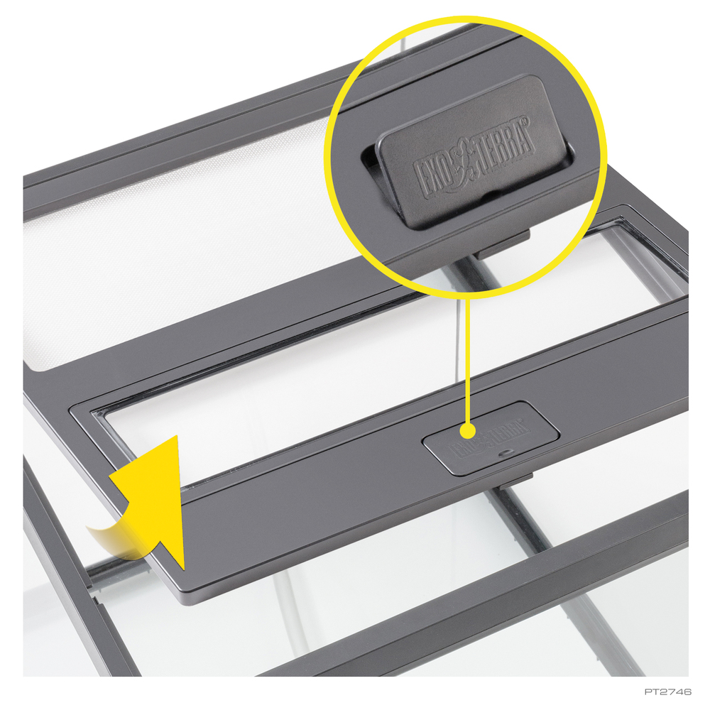 Відкидна кришка може бути заблокована та розблокована однією кнопкою і може бути повністю відкрита. Прозора скляна панель спереду забезпечує максимальне проникнення видимого світла, а вентиляційна смуга з нержавіючої сталі ззаду гарантує оптимальну вентиляцію. Запатентована подвійна система вентиляції запобігає утворенню конденсату на одинарних передніх скляних дверцятах навіть у вологих умовах. Вона створює природний висхідний потік повітря для забезпечення оптимальних та здорових умов. Надлишкове тепло розсіюється через верхню сітку та запобігає накопиченню тепла, створюючи температурні градієнти в тераріумі. Сітчаста кришка дозволяє проникати UV та інфрачервоним променям, якщо ці лампи потрібні. Чотири самозакривні вхідні отвори для проводів/трубок ззаду спрощують встановлення аксесуарів, що працюють від електромережі, як-от насоси для водоспадів, фільтри, система Exo Terra Monsoon тощо. Усередині передньої частини кришки розташована точка кріплення для насадки Monsoon з кожного боку тераріуму.