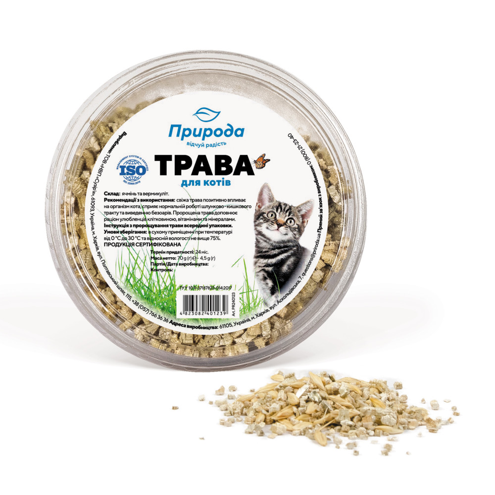 Трава для котів ТМ «Природа» є джерелом вітамінів А, В, D, Е, а також мінеральних речовин таких як: кремній, фосфору, калію, кальцію, магнію, сірки, марганцю, селену, йоду, цинку, брому, міді, – а також рослинних волокон, які стимулюють роботу шлунка та кишківника.