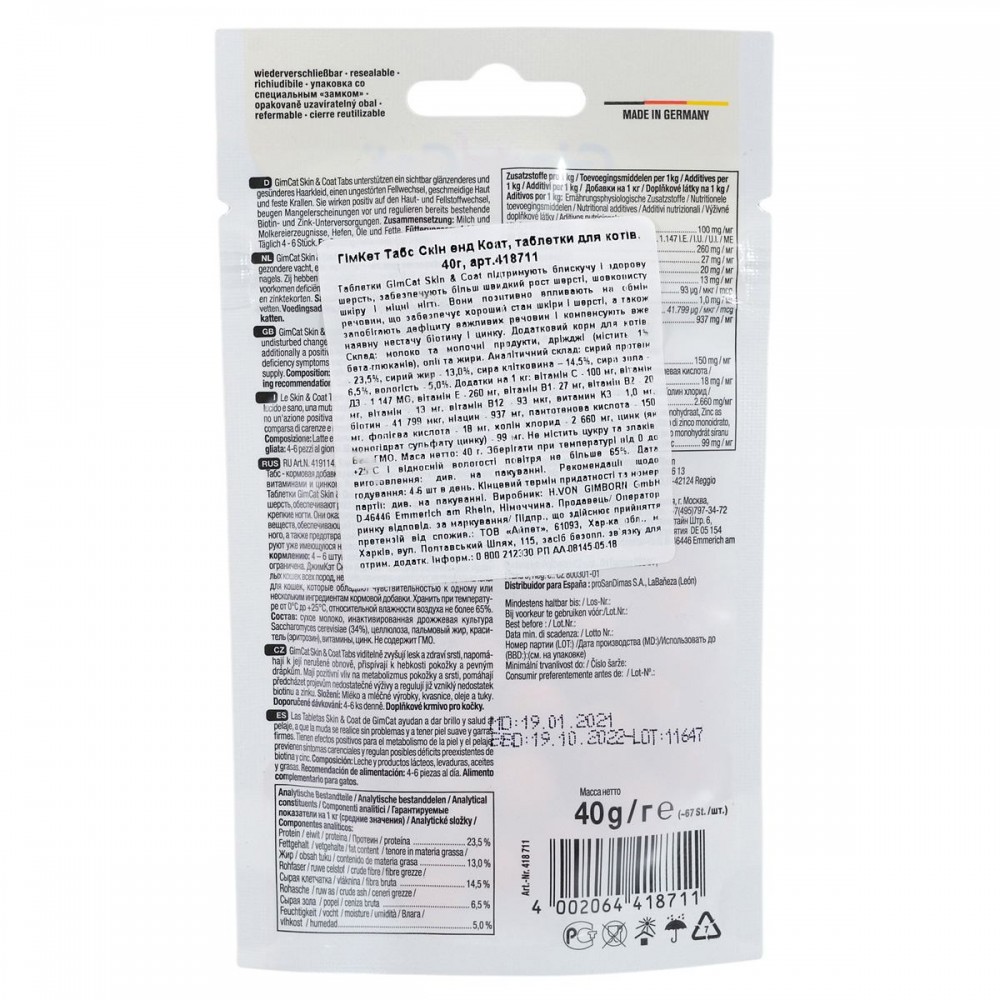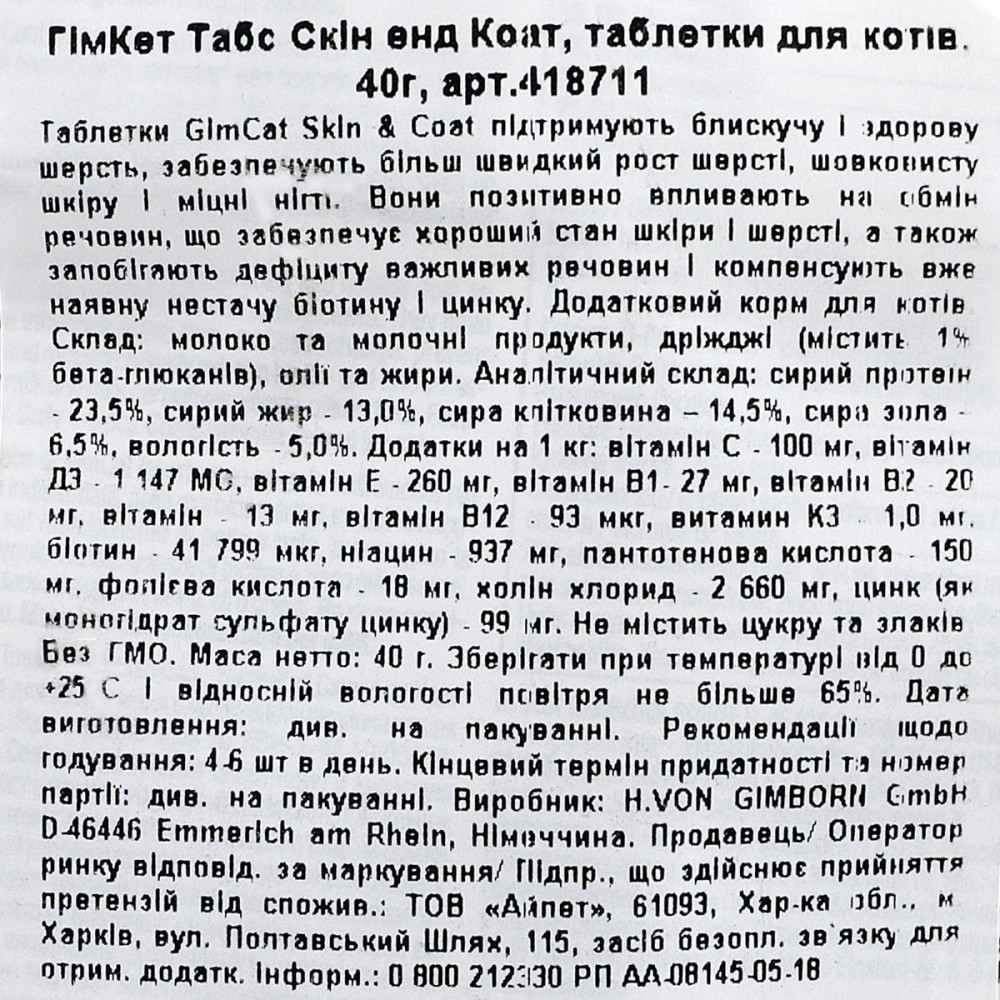 В складі містить таурин для гостроти зору, а також: баластні речовини, деріват молочного цукру з ТГОС, вітаміни групи В, пивні дріжджі, мінеральні речовини. Особливо рекомендований комплекс для котів з довгою шерстю, для тварин в період линьки, та для котів, що приймають участь у виставках.