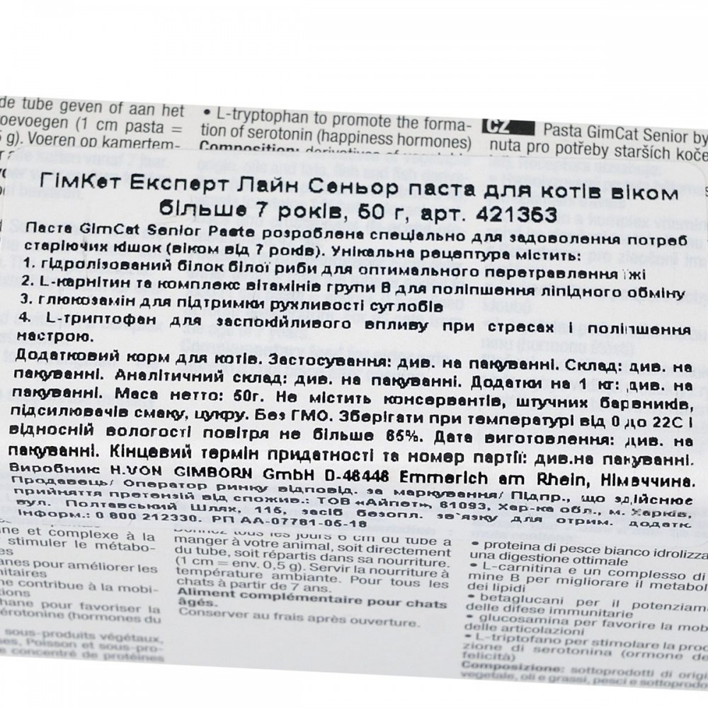 - Паста GimCat Senior із збалансованою формулою антивікового догляду містить: