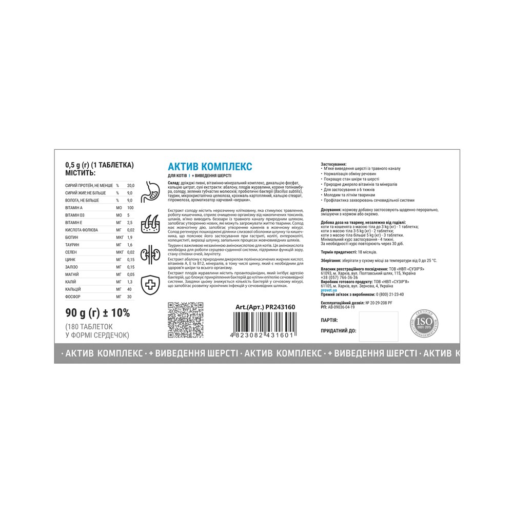 Форма випуску: таблетки по 180 шт. у полімерному флаконі. РП № АВ-09036-04-19. Сертифікат: ISO 9001:2015.