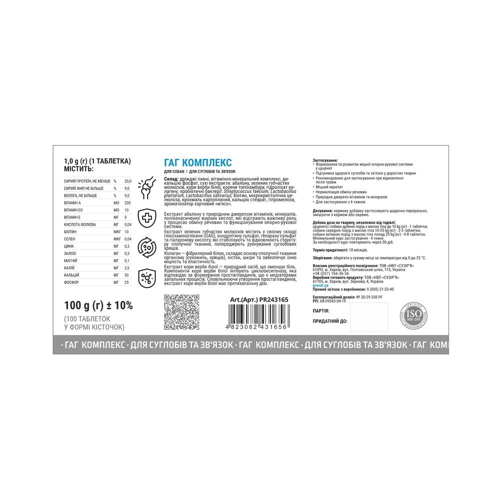 Склад: Дріжджі пивні, вітамінно-мінеральний Комплекс, дикальцію фосфат, сухі екстракти: абалону, зелених губчатих молюсків, кори верби білої, кореня топінамбура; гідролізат колагену, пробіотичні бактерії: Streptococcus faecium, Lactobacillus plantarum, Lactobacillus salivarius; Біотин, мікрокристалічна целюлоза, крохмаль картопляний, кальцію стеарат, гіпромелоза, ароматизатор харчовий «м'ясо».