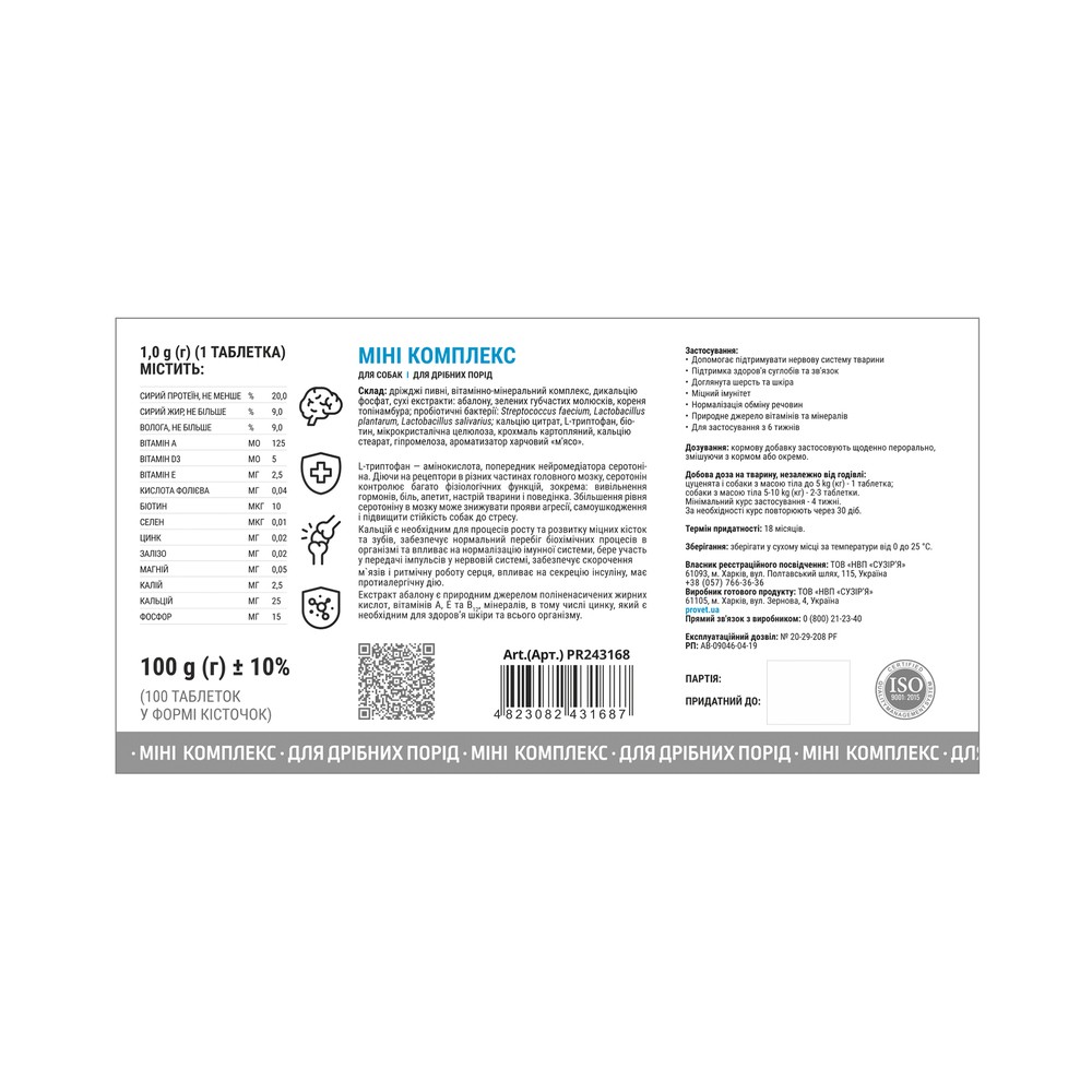 Склад: Дріжджі пивні, вітамінно-мінеральний Комплекс, дикальцію фосфат, сухі екстракти: абалону, зелених губчатих молюсків, кореня топінамбура; пробіотичні бактерії: Streptococcus faecium, Lactobacillus plantarum, Lactobacillus salivarius; кальцію цитрат, L-триптофан, Біотин, мікрокристалічна целюлоза, крохмаль картопляний, кальцію стеарат, гіпромелоза, ароматизатор харчовий «м'ясо».