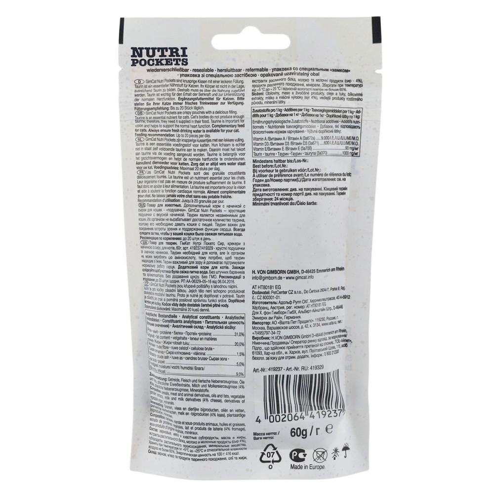 Ласощі GimCat Nutri Pockets з сиром і таурином – це хрусткі подушечки із смачною начинкою. Таурин необхідний для котиків, але їх організм не виробляє цю амінокислоту, тому її необхідно додавати в раціон. Таурин важливий для зору та допомагає підтримувати функцію серця.