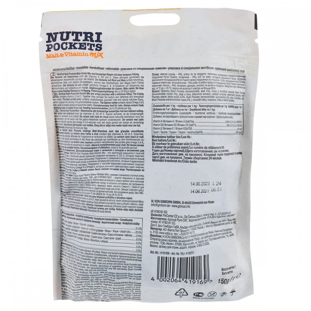 Вітамінні ласощі GimCat Nutri Pockets Мальт-Вітамін Мікс – хрусткі подушечки зі смачною начинкою з котячої м’яти, яловичини з солодом і лососем.