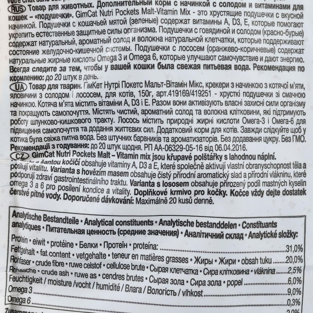 Рекомендації з годування: пригощайте вашого котика ласощами Nutri Pockets до 20 шт. на день. Завжди слідкуйте за тим, щоб в улюбленця була свіжа питна вода.