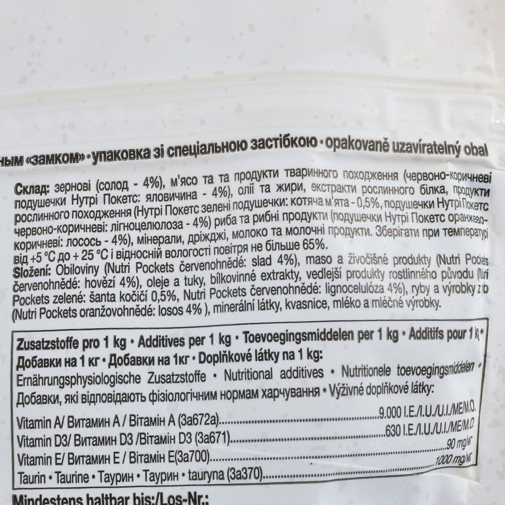 Склад: зернові (солод - 4%), м’ясо та та продукти тваринного походження (червоно-коричневі подушечки Нутрі Покетс: яловичина - 4%), олії та жири, екстракти рослинного білка, продукти рослинного походження (Нутрі Покетс зелені подушечки: котяча м’ята - 0,5%, подушечки Нутрі Покетс червоно-коричневі: лігноцелюлоза - 4%) риба та рибні продукти (подушечки Нутрі Покетс оранжево- коричневі: лосось - 4%), мінерали, дріжджі, молоко та молочні продукти.