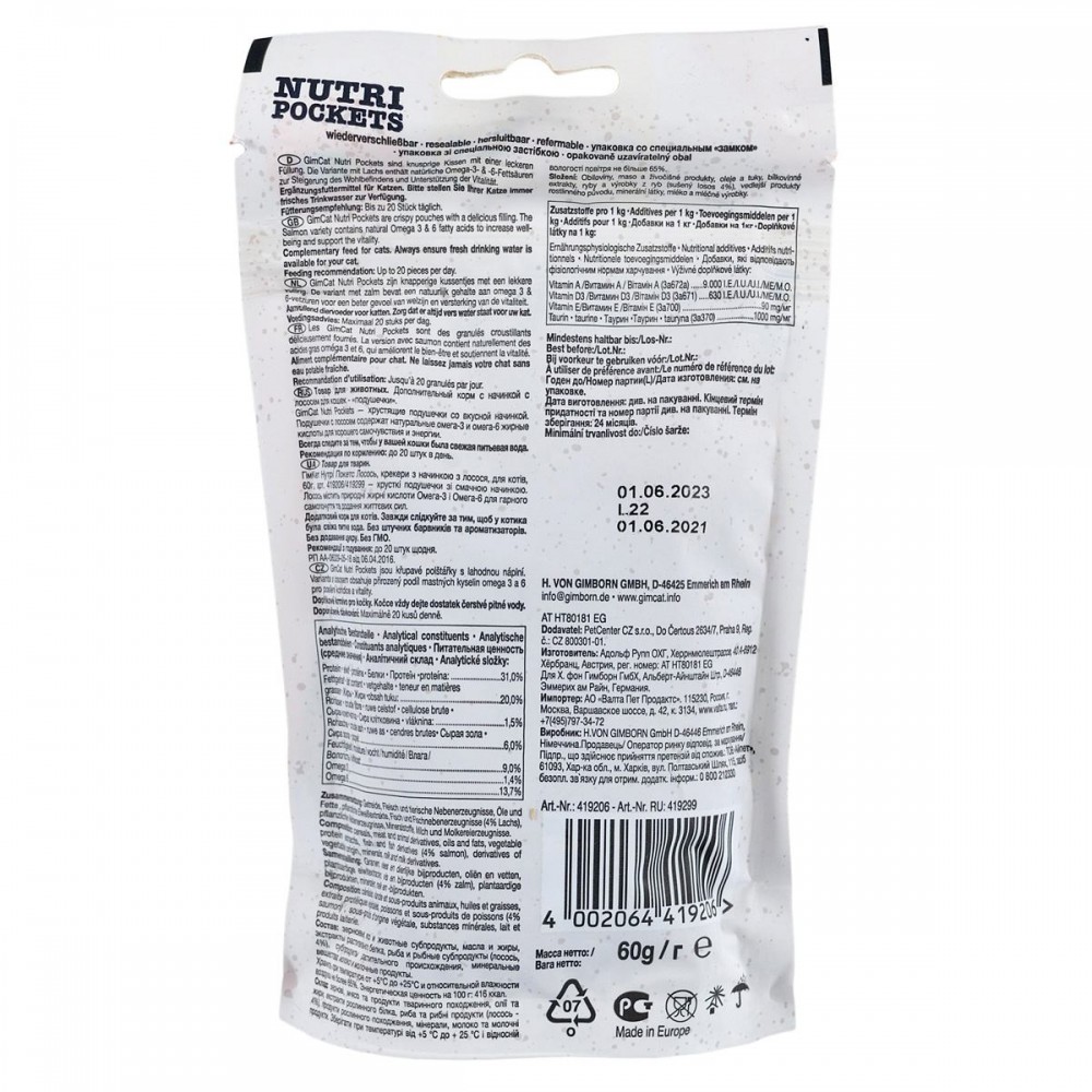 Вітамінні ласощі GimCat Nutri Pockets з лососем та Омега 3 і 6 – це хрусткі подушечки із смачною начинкою. Лосось містить натуральні жирні кислоти Омега 3 і 6 для зміцнення імунної системи та здоров’я котика.