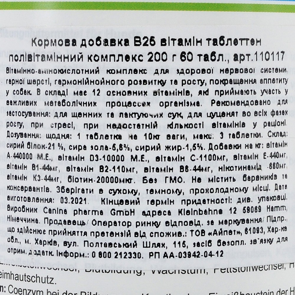 Для того, щоб забезпечити організм всіма необхідними вітамінами і доповнити раціон тварини важливими амінокислотами спеціально був розроблений продукт V25, що містить комплекс з 12 основних вітамінів і найважливіших амінокислот.