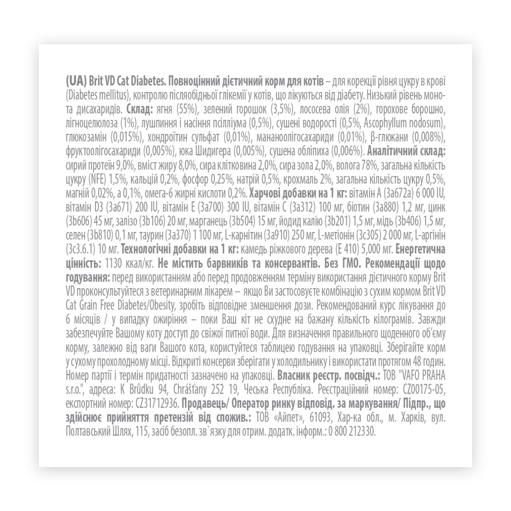 Інструкція з годування. Проконсультуйтеся з ветеринаром з приводу використання дієтичного корму Brit GF VetDiet – якщо він поєднується з сухим кормом, зменшуйте дозу відповідно. Початковий термін годування має тривати мінімум 6 місяців в разі ожиріння до тих пір, поки кіт не схудне до бажаної ваги. Рекомендується проконсультуватися з ветеринаром перед використанням або перед продовженням періоду використання корму. Переконайтеся, що кіт завжди має доступ до свіжої питної води.