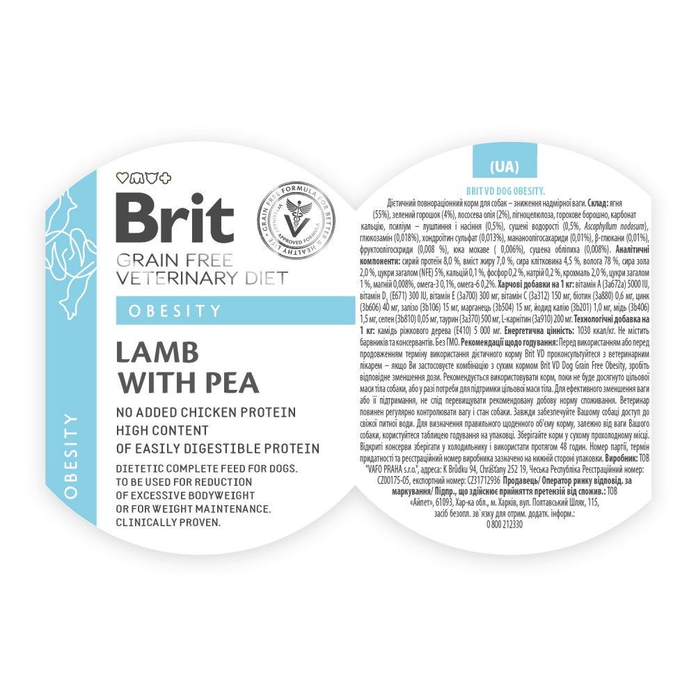 Підтримання оптимальної ваги: Після досягнення бажаної ваги тіла годуйте собаку скорегованою кількістю корму Brit GF VetDiet Obesity протягом подальших 6-ти місяців або на довготривалій основі.