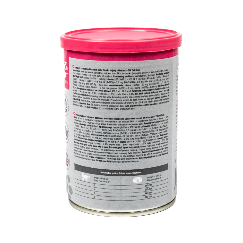 М’ясні шматочки в желе Pet Chef — це збалансований повнораціонний вологий корм для дорослих котів, який є чудовим вибором для тих, хто хоче забезпечити своїх улюбленців смачним та поживним раціоном. Кожен шматочок корму містить мінімум 85% м’ясних інгредієнтів, що задовольнить потреби тварини у білках та енергії, а також оптимальну комбінацію макро- і мікроелементів, вітамінів і амінокислот, необхідних для її розвитку та загального здоров’я. Желе підсилює апетитність, роблячи кожен шматочок надзвичайно соковитим і ароматним.