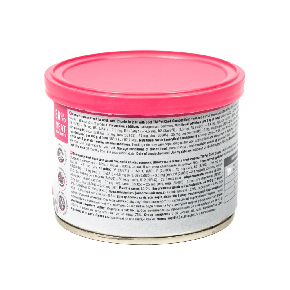 М’ясні шматочки в желе Pet Chef — це збалансований повнораціонний вологий корм для дорослих котів, який є чудовим вибором для тих, хто хоче забезпечити своїх улюбленців смачним та поживним раціоном. Кожен шматочок корму містить мінімум 85% м’ясних інгредієнтів, що задовольнить потреби тварини у білках та енергії, а також оптимальну комбінацію макро- і мікроелементів, вітамінів і амінокислот, необхідних для її розвитку та загального здоров’я. Желе підсилює апетитність, роблячи кожен шматочок надзвичайно соковитим і ароматним.