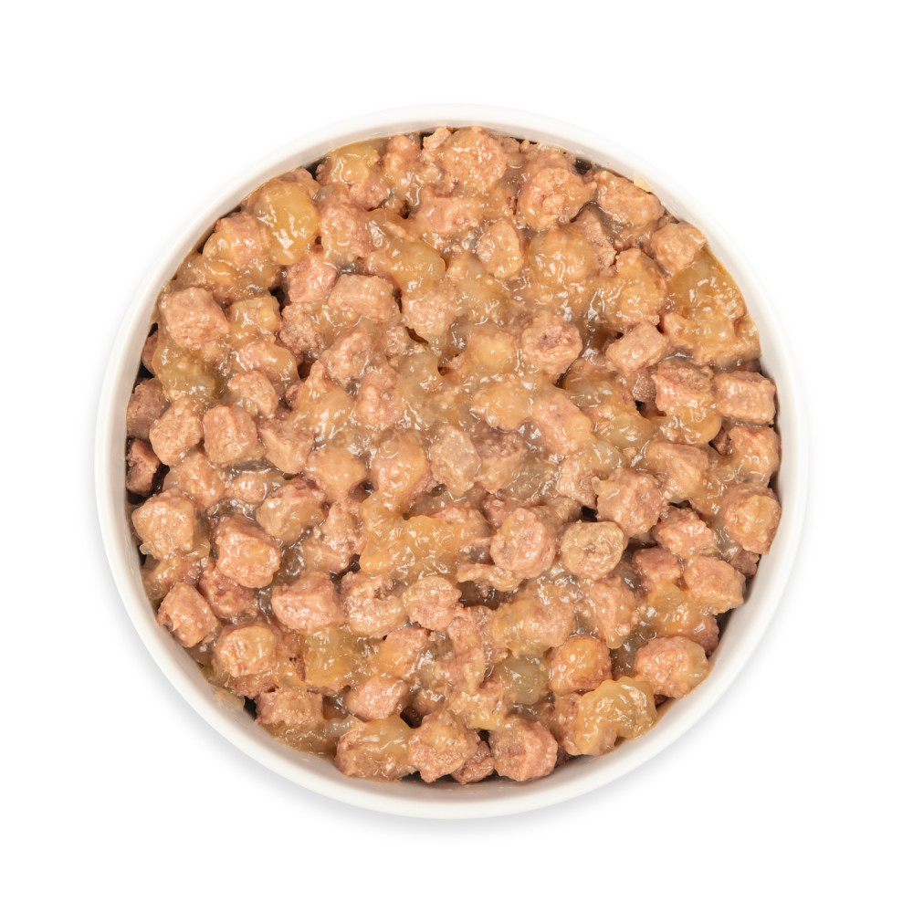 Склад: м'ясо та продукти тваринного походження не менше 85% у шматочках (зокрема з курки – 54%, з яловичини – 24%, з індички – 7%), злаки. Шматочки становлять не менше 50%.